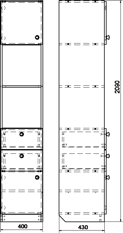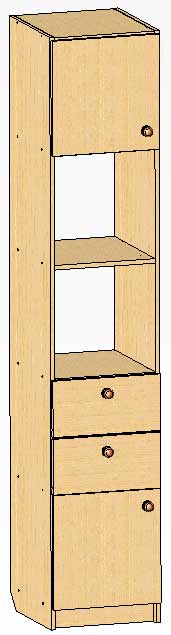 Стеллаж открытый СГ-5, с двумя открытыми нишами, двумя выдвижными ящиками, и дверцами на верхнем и нижнем отделениях. Используется в детских дошкольных учреждениях, как отдельно стоящий или при формировании секции из стеллажей