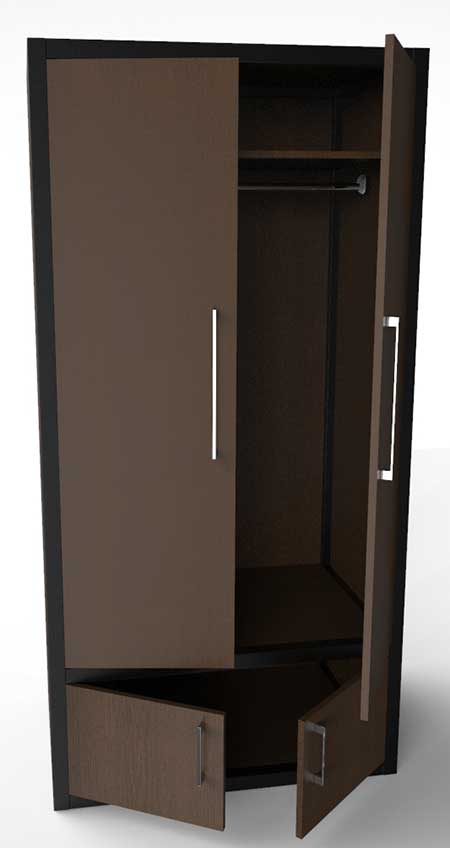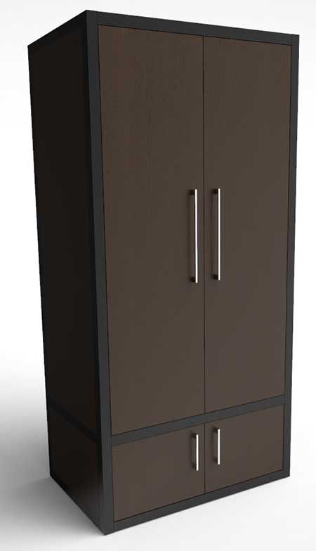 Шкаф для одежды Л-40од больше тяготеет к традиционному виду. Так - же выполнен на цельносварной раме из толстостенного профиля квадратного сечения с полимерным матовым покрытием черного цвета. В рамках каркаса крепятся стенки, полки, дверцы из ЛДСП темного цвета с нанесением кромки ПВХ на торцах. Как мы уже говорили, по желанию заказчика, могут быть открыты или закрыты любые из стенок.