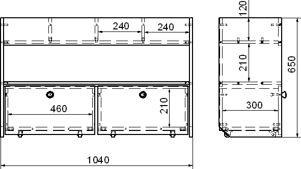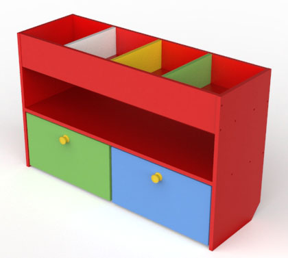 Сверху стеллажа для конструктора, имеются четыре открытых отделения, под ними – широкая полка. На полу, между боковыми стенками стеллажа располагаются два выкатных ящика на колесных опорах.