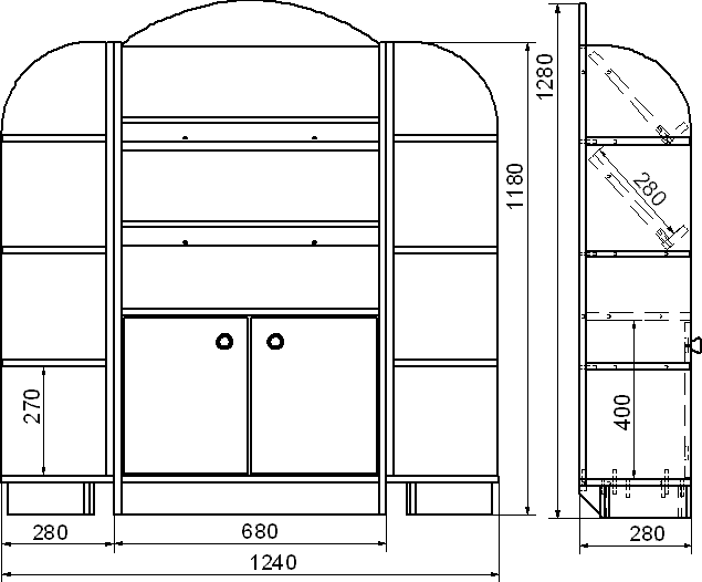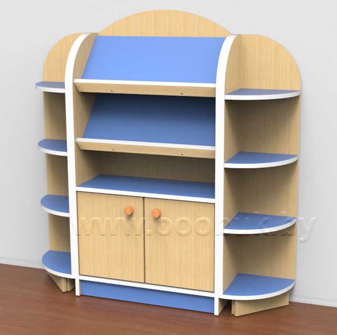 Стеллаж детский игровой Библиотека состоит из трех стеллажей. Центрального – с наклонными полками и боковых с открытыми радиусными полками.