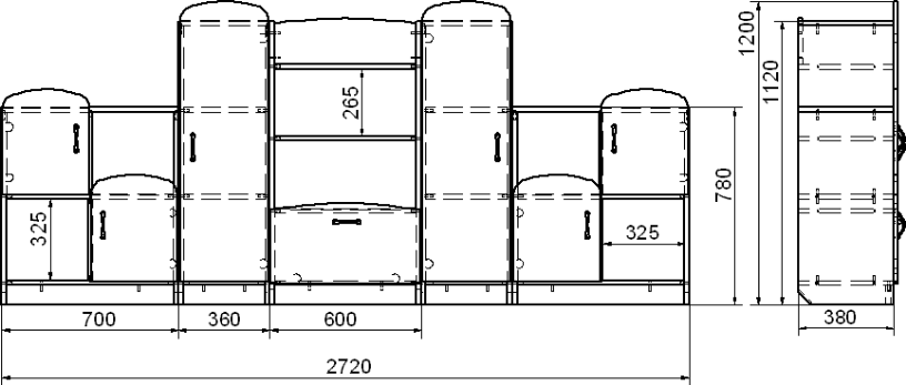 Пять стеллажей, различных по конструкции соединены между собой в единую стенку – модуль.